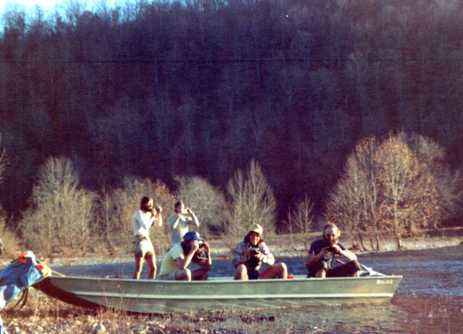 ![]() Philippe Vermeyen, William Ewart, John Mills, Jr., Stacey Waring, Joe Shute Everyone taking a picture of Rip (Jerri Hudson) crossing the Buffalo River December 11, 1980 |